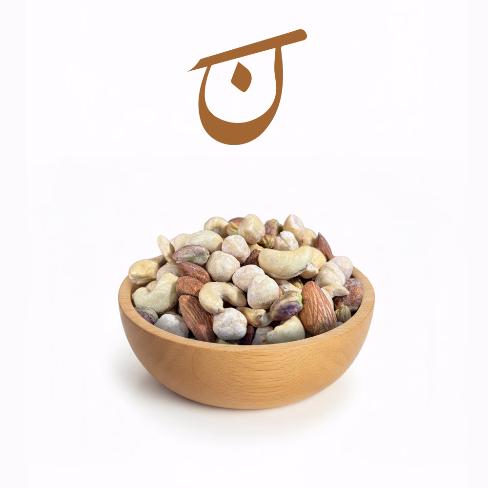 - نوع: مخلوطی از مغز فندق، پسته، بادام و بادام هندی، بو داده و نمکی.